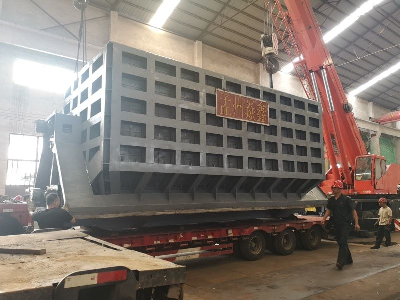 熄焦車是通過電機車牽引的,開門氣缸的氣源在電機車上,來自電機車的壓縮空氣通過軟管連接器,以及氣路傳給氣缸。電機車可以在熄焦車兩端掛鉤牽引,壓縮空氣可以在熄焦車的兩端接通,當電機車在熄焦車的左端掛鉤時,關閉熄焦車上氣路的右端球閥,反之,當電機車在熄焦車的右端掛鉤時,關閉熄焦車上氣路的左端球閥?! ∠ń管嚨拈_門機構采用齒輪、齒輪傳動,齒條與驅動氣缸的活動賽桿,通過銷軸鉸接在一起,氣缸兩端進氣,帶動齒條前后移動,裝在傳動主軸上的齒輪與齒條嚙合,這樣在齒條的移動過程中使得齒輪轉動,軸也轉動,從而使裝在主軸兩端的擺桿將熄焦車的左右車門打開(或關閉),以達到卸焦和關門的目的。 熄焦車上開門機構的擺桿可以在圓周上旋轉128°角。在128°擺角的兩極限位置上有剛性限位及限位開關,以保證左右車門開啟位置在650±20mm范圍內。限位開關只起車門開到極限位置時的報警作用。